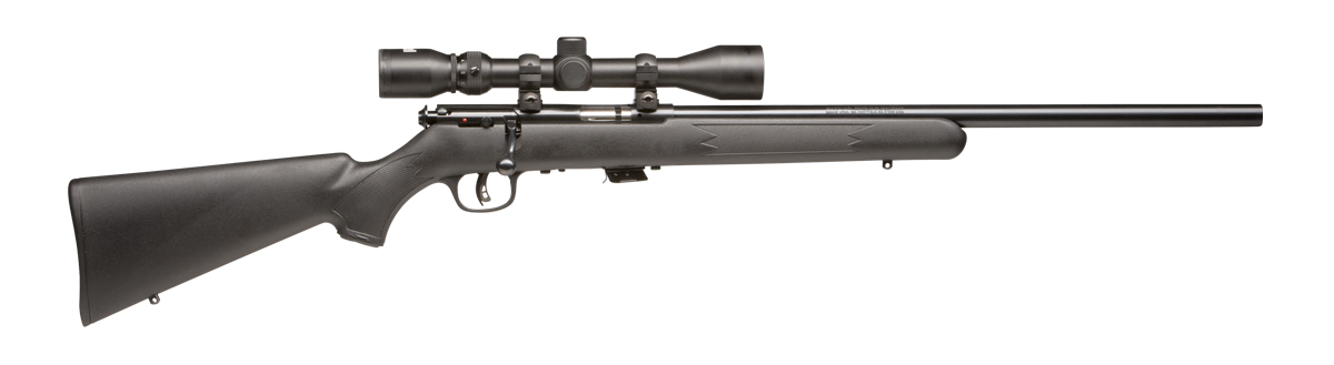 The Savage Mark II FVXP 22LR (SKU 29200) is a bolt-action rim fire rifle designed for target shooting and small game, featuring a 21-inch heavy carbon steel barrel and a black synthetic stock. It includes a factory-mounted/bore sighted 3-9x40mm scope, the user-adjustable AccuTrigger, and a 5-round detachable box magazine.